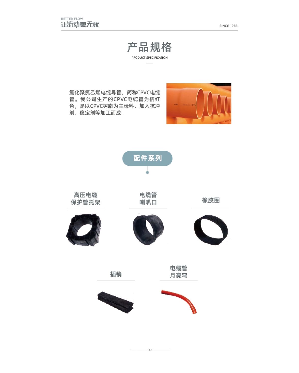 氯化聚氯(lǜ)乙烯電纜導(dǎo)管(guǎn),簡稱CPVC或(huò)PVC-C電力管、CPVC電力電纜保護管、電力行業標準上中文名稱為(氯化聚氯乙烯電(diàn)纜導(dǎo)管)。我公司生產的CPVC電力管為桔紅色,是以CPVC樹脂(氯化聚氯乙烯含氯量大於67%)為主母料,加入抗衝劑,穩定(dìng)劑等輔料,經擠出成型(xíng)的塑料實壁管材。產品廣泛應(yīng)用在城市電網建設和改造城市市政改造工程、民航機場工程建設、工業園區、小區工程建設(shè);交通、路(lù)橋工程建設;城市路燈電纜敷設;電信通訊(xùn)、有線(xiàn)電視信號城域網線及光(guāng)纜鋪設護套管網。