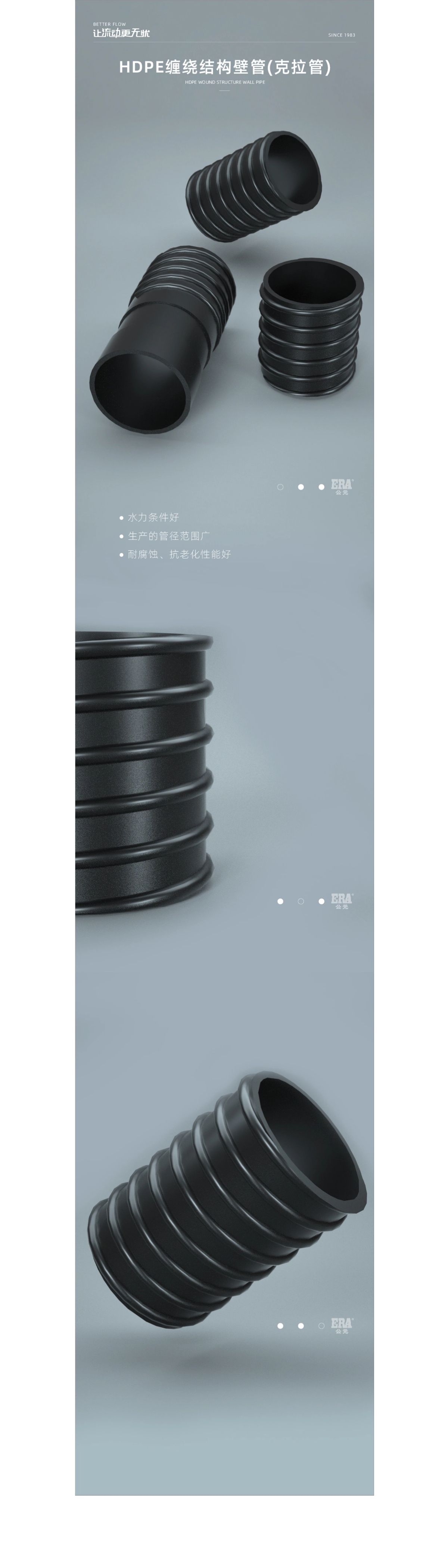“永高”牌——聚乙烯(xī)(PE)纏繞結(jié)構(gòu)壁B型立交思危管(俗稱克拉管(guǎn),以下簡稱克(kè)拉管),是一種內壁光滑、外壁為螺旋狀加強肋,由底膜和肋界麵為O型的肋管經螺旋纏繞工(gōng)藝製成的異形結構壁柔性管材,采用高密度聚(jù)乙烯為原料,在熱熔狀態下通過纏繞(rào)工藝一次(cì)成(chéng)型,並在熱(rè)態未脫模前通過滾動風冷方式冷(lěng)卻,管道逐步(bù)散熱,壁厚均勻,無內應力管道連接(jiē)采用承(chéng)插式(shì)電熔(róng)連接和節(jiē)流式承(chéng)插連接,施工便(biàn)捷且安全零滲漏,在全世界(jiè)範圍內早已得到廣泛應用,在中國被建設部評為重點推廣產品,是國家推廣城市雨汙水係統“以塑代鋼、以塑代水泥(ní)”的新型優質管材產品。經過不(bú)斷研發創新,該產品抗震設防烈度達9級,適(shì)用於不均勻沉降地質區域及地震(zhèn)帶區域。