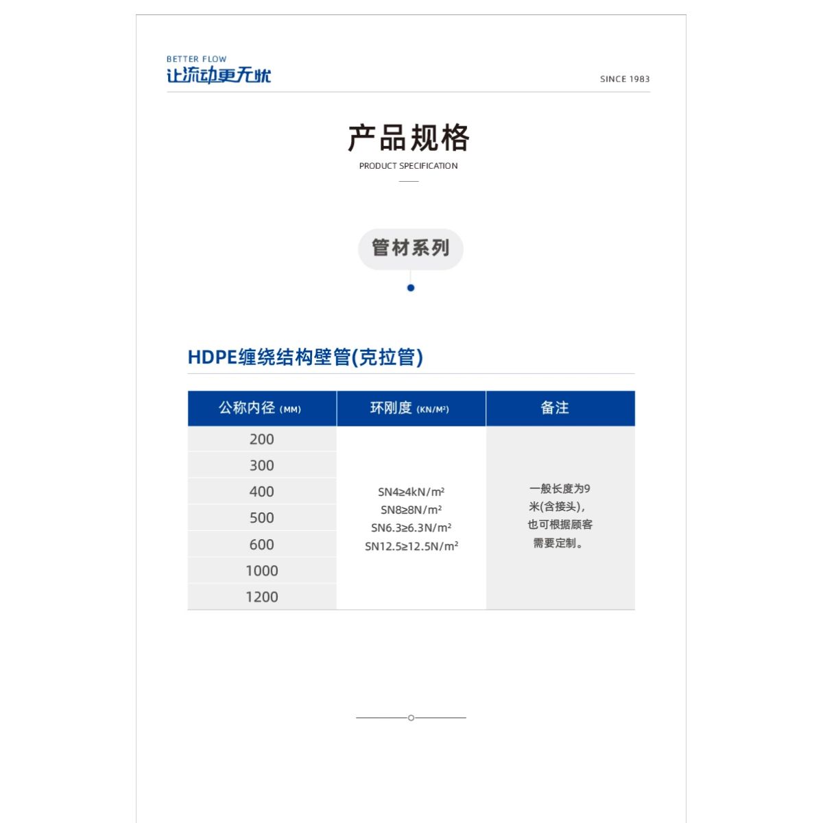 是(shì)一種內壁光滑、外壁為螺旋狀(zhuàng)加強肋,由底(dǐ)膜和肋界(jiè)麵為O型的肋管經螺旋纏繞工藝製成的異形結構壁柔性管材,采用高密度聚(jù)乙烯為原料,在熱熔狀態下通過纏繞工藝一次成(chéng)型,並在熱(rè)態未脫(tuō)模前(qián)通過滾動(dòng)風冷方式冷卻(què),管道逐步(bù)散(sàn)熱,壁厚均勻,無(wú)內應力;管道連接采用承插式電熔連接和節流式承插連接,施工(gōng)便捷且安全零滲漏,在全世界範圍內早已(yǐ)得到廣泛應用,在中國被建設部評為重點推廣產(chǎn)品,是國家推廣城市雨汙水係統“以塑代鋼、以塑(sù)代水泥”的新型優質管材產品。經過不斷研發創新,該產品抗震設防烈度達9級,適用於不均勻沉降地(dì)質區域及地震帶區域。管道執行標準:GB/T19472.2埋地用聚乙烯(PE)結構壁管道係(xì)統第(dì)二部分聚(jù)乙烯纏繞結(jié)構壁(bì)科(kē)管材。